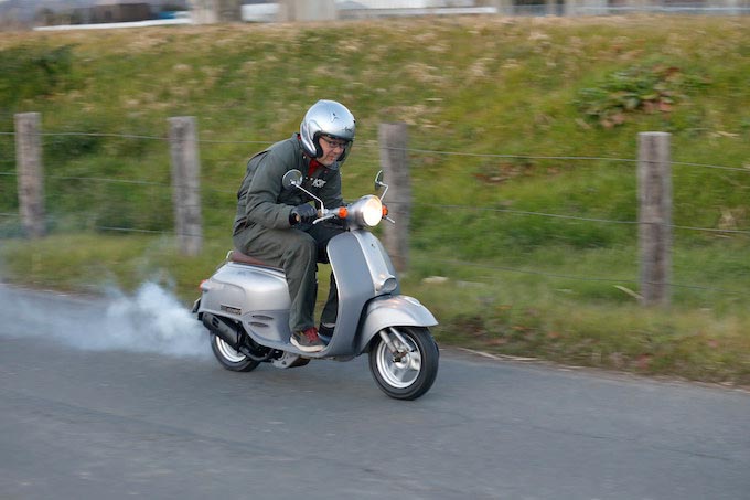 ぐんぐん加速していってあっという間にスピードメーターの針が上昇していく。小径タイヤ&短いホイールベースの不安定感にこの加速が2スト原付スクーターならではのスリル感だろう。駆動系の部品が新品なので100kmくらいは全開加速を避けたいが、それでも一般道で車の流れには充分乗れそうだ。