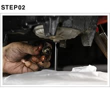 | ドロやオイル染みによって固着した汚れを落とし、ドレンボルトとオイルフィルターキャップの位置を確認。メガネレンチをあて、緩める方向を確認し、最初の一撃は手のひらでレンチを叩いて強いインパクトを与える。 | ネジが硬いのは最初だけで、緩めてしまえば指で回すことができる。排油処理にはオイル処理ボックスを用意しよう。燃えるごみとして出せるので、一般家庭での作業にはこれが最適。ドレンボルトを落としてなくさないよう注意。 | ドレンボルト同様オイルフィルターのマウントを緩めると、エレメントと一体で外れてくる。ここにも結構な量のオイルが溜まっていて、外した瞬間にドバッと流れ出てくるので、周囲にこぼさないよう注意。 |