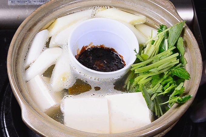 4/温まった豆腐やネギなどに、湯のみで作ったしょう油タレを掛けて食べてください。