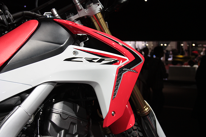外装デザインも「最先端であるCRFをモチーフ」としている。「法規制の関係から、ヘッドライトがどうしても大きくなってしまうのですが、最終的にはmm単位で小さくして、世界中の法規制に適合させながらもデザイン性にこだわりました」と、塚本氏は開発時の苦労点を教えてくれた。ちなみに、ここまでスタイリングが決まっていると、オフ仕様でさえまだ市販予定モデルという段階ながら、モタード仕様の発売が気になるところ。塚本氏によると、「日本だけでなく世界中の市場で、すでにそういう声が上がっています。我々としても検討すべき要素」なのだとか。今後の新たな発表にも注目したいところだ。
