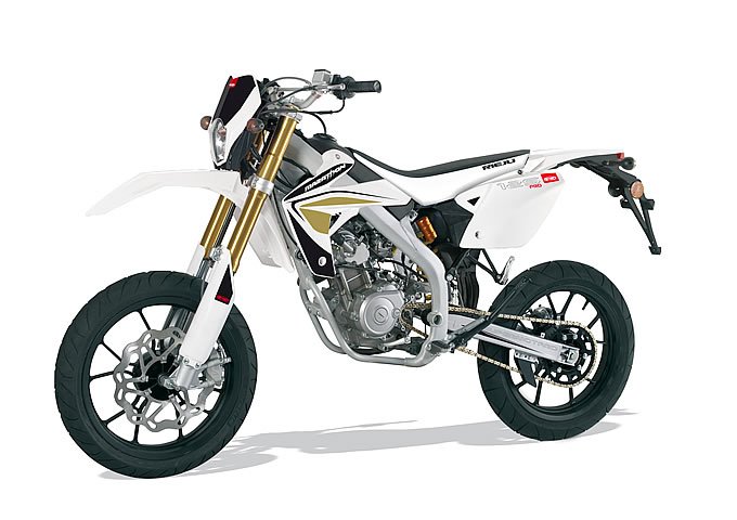 デュアルパーパスのTE125と同時設計された公道用モタード。フルサイズの本格ボディと、キャブ仕様で15馬力の124.45cc水冷単気筒エンジンを組み合わせる。