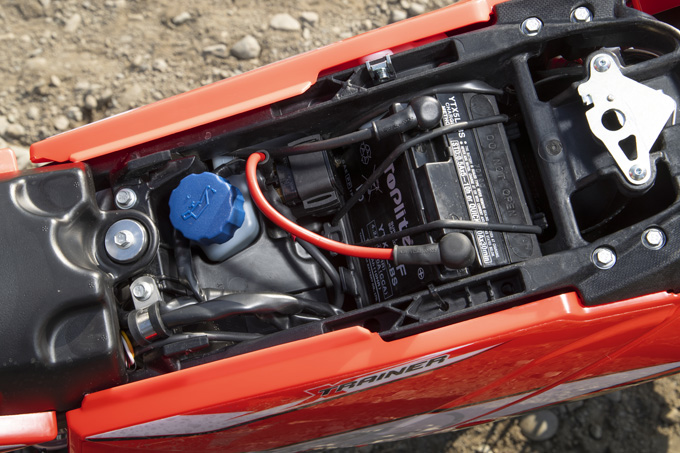 シート下の青いキャップが2ストオイル用のタンク。エンジン回転数とスロットルポジションセンサーで負荷を測定し、ECUが使用状況に最適なオイル量を吐出する。バッテリーもシート下に設置し、重量マスを集中化している。