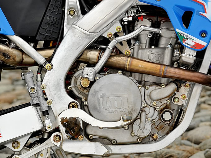 ほどよく抑えられた音量のサイレンサー。日本で発売される4ストロークのtmは保安部品標準装備。