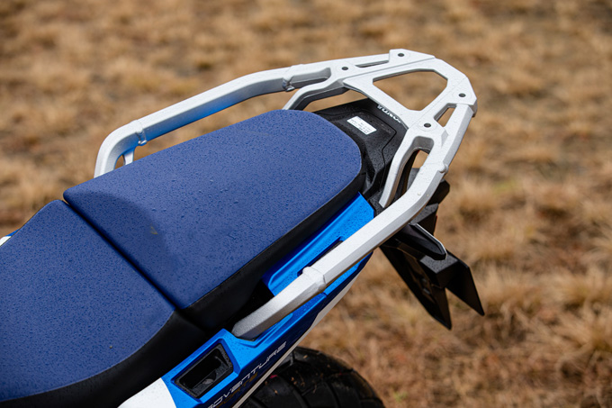 リアキャリアはアルミ製で、タンデムシート座面とフラットになるように設計されているため荷物の積載性能が高い。センタースタンドをかける際や引き起こし時にも便利。