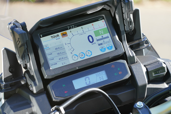 アフリカツインESはロングスクリーンが採用されているため、ハイウェイクルーズでも快適であるし、スマートフォンと連動することができる6.5インチタッチパネル液晶メーターも、ツーリングの強い味方となってくれる。