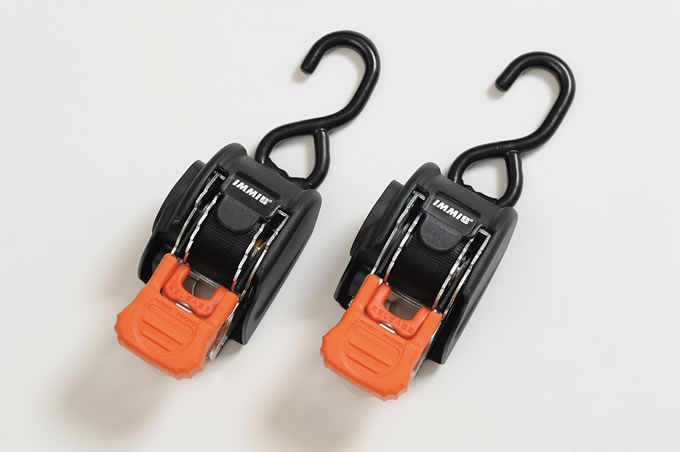 Klimから簡単にすばやく固定でき、コンパクトに収納できるラチェット式タイダウンベルトが登場。自動ロールアップ機能やラチェット式の採用により、トランポ積載時の車両固定のわずらわしさを軽減している。