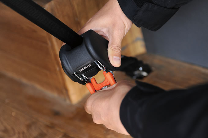 バイクを固定するには、ハンドル下にあるリリースレバーを引き上げながら、ハンドルをリリース位置にセット。するとタイダウンベルトを引き出せるようになる。引き出したタイダウンベルトは自動ロールアップ機能が絶えず巻き上げようとするので、余分なたるみが出ない。無駄に引き出しすぎるのを防げるので、実際に使用してみると誰でも便利さを体感できるだろう。フックをトランポとマシンに引っかけたら、ハンドルをリリース位置から解除し、あとはハンドルを上下させるだけ。バイクのサスを自分で縮めることなくテンションをかけられ、しかも一般的なタイダウンベルト以上にがっちり固定できた。ハンドルをストッパー位置に合わせれば作業は完了だ。