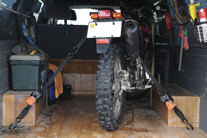 タイダウンベルトは、トランポにバイクを積載するのに欠かせないアイテムで、オフロードライダーにはポピュラーな存在と言えるだろう。バイクのサスを縮めたタイミングに合わせてタイダウンベルトを締め込むという操作方法自体は簡単でありながら、すばやく確実に固定するには慣れやコツが必要となり、またタイダウンベルトも複数本必要になるという面がある。