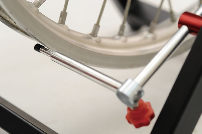 オフロードバイクのほとんどのモデルはスポークホイールを採用している。それは、スポークホイールは軽量なのでバネ下重量の軽減になり、サスペンションの作動性を損なわないというメリットがあるからだ。さらにホイール自体がたわむことで路面からの衝撃を吸収するという特性もある。たわむことが大きな役割を果たしているが、それがホイール自体のゆがみにつながり、ハンドリングや乗り心地の悪化を引き起こしてしまう。そこでスポーク調整を行うことになるのだが、スポークの緩んでいる部分やホイールのゆがんでいる部分を見つけるには専用の工具が必要となる。