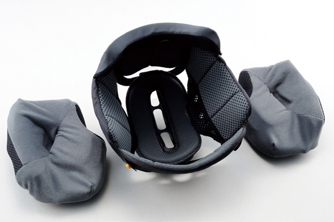 ③システム内装は頬だけでなく、アゴ全体を包み込むような形状となっている。頬を強く圧迫することなく、頭とヘルメットの密着性を高めることができるのが特徴。高速走行時にブレず、快適なかぶり心地を両立する要因となっている。