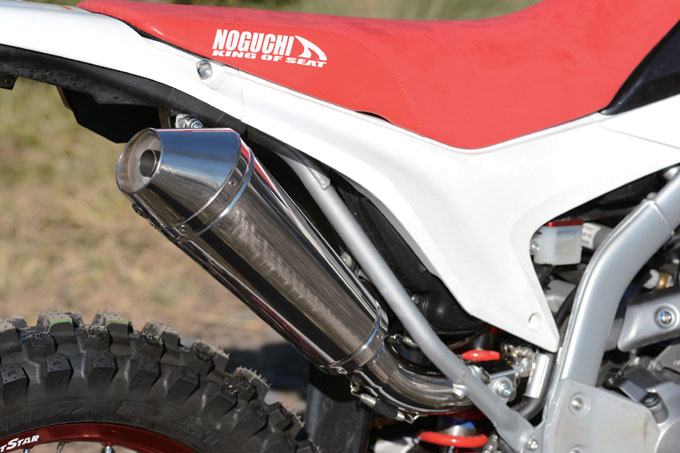 ⑤真後ろから見た装着状態。跳ね上がり・張り出し具合はノーマル以上だが、ボディアクションした際に接触することはなかった。コンパクトながら、しっかり消音し、スムーズな吹け上がりを実現している。低速トルクも減少せず、小気味良いピックアップを体感できる仕上がりになっている。