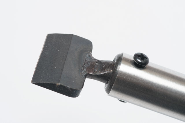 ①1トレッドドクターの要となるヒートカーバイド。片面に傾斜をつけることでタイヤブロックが削りやすくなっている。