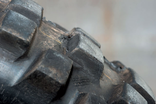 ③レースと練習走行に使用したエンデューロタイヤ。タイヤブロックの角が丸くなっているのが分かる。