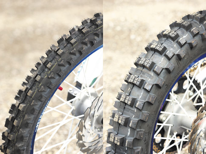 世界エンデューロ選手権で使用されているゴールデンタイヤ。その新パターンが日本に導入された。フロント用GT216AAは、マディからハード路面まで幅広くカバー。コーナリング性と排泥性が良好で、FIM公認の公道走行可モデル。リヤ用GT230はゴールデンタイヤのモトクロスラインナップで唯一の18インチ。マディ・サンドからインターミディエイトまで幅広くカバーし、公道走行規定のないエンデューロに向いた特性となっている。