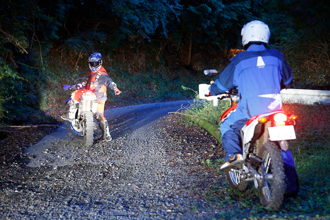 林道のプロローグともいえるアスファルト。こんな舗装路、楽勝だよと気を抜きがちだが、じつはダート以上に難しさと危険が潜んでいる。例えば、路面中央に生えている苔や堆積した砂利はスリップや転倒の原因になる。また速度も高めになりがちなので、コーナーでは対向車と出会い頭の正面衝突も起こりやすい。「アスファルトは、ダート部分以上に神経を張り巡らせて走っている」とはユータロー先生。どんなケースがあるか見ていこう!
