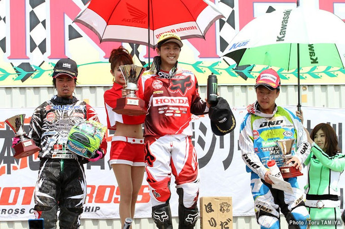 04IA-1決勝ヒート1の表彰台。中央が優勝したホンダの成田亮選手、左が2位に入ったスズキの小島庸平選手、右が3位となったカワサキの新井宏彰選手。