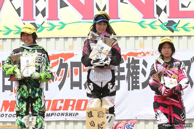 17レディースクラスの表彰台。中央が、「安原さや、完全復活です」と笑顔をみせた優勝の安原さや選手。左が2位の畑尾樹璃選手、右が3位の邵洋子選手。