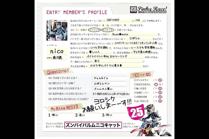 34【エントリーライダー紹介プロフィール】キューティーハニーM 藤岡選手(CR80)