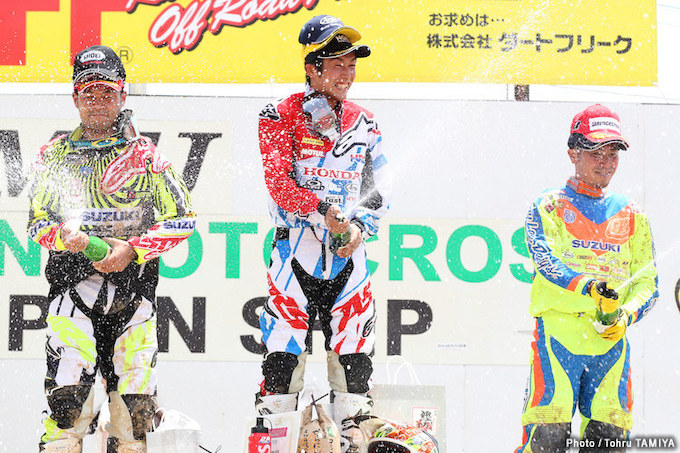 05IA-1決勝ヒート1の表彰台。写真中央が、今季初優勝を収めたホンダの小方誠選手(#2)。同左が、2位となったスズキの熱田孝高選手(#4)、同右が自身の誕生日に3位となった同じくスズキの小島庸平選手(#44)です。