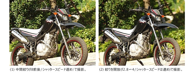 まず、絞り優先モードの活用法から考えていきましょう。例えば、背景がイマイチな時などに絞り優先モードは役立ちます。実際、愛車を撮ってみようという場合、常に背景がきれいといったことはさほどありませんよね。そこで以前もご紹介した背景のぼかしが重要になってきます。背景をぼかすには、絞りを開き撮影を行うとよいです。例として2枚の写真を撮影してみました。まず(1)の写真をご覧ください。中間絞り(f8前後/シャッタースピードは遅め)で撮影すると背景の邪魔な景色も見えてしまい、ちょっとごちゃごちゃした雰囲気の写真になってしまいました。写真(2)は絞りを開放ぎみ(f2.8~4/シャッタースピードは速め)に設定。背景の邪魔な景色が見事にぼかし撮影することができました。バイクが強調されて見やすいですね。