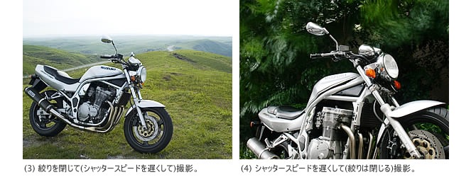次に、シャッタースピード優先モードの活用法を考えましょう。例えば撮影時、バイクの背景に木々が揺れているような状況。せっかくですから木々のざわめきなども写真に反映したいところですね。こういった動きを滑らかに表現したい場合は、シャッタースピードを遅めにすると効果があります。では下の2枚の写真をご覧ください。(3)は絞りを閉じて、できるだけ写真の全面にピントが合うようにしてみました。(4)はシャッタースピードを遅くして(=絞りを閉じる)、バイク背景の木のざわめきを表現したものです。また、噴水や波などはシャッタースピードを速めれば粒を捕らえられますし、遅くすれば流れを捉えることができます。シャッタースピードだけでもずいぶんとさまざまな表現ができると思いませんか? ぜひご活用いただければと思います。
