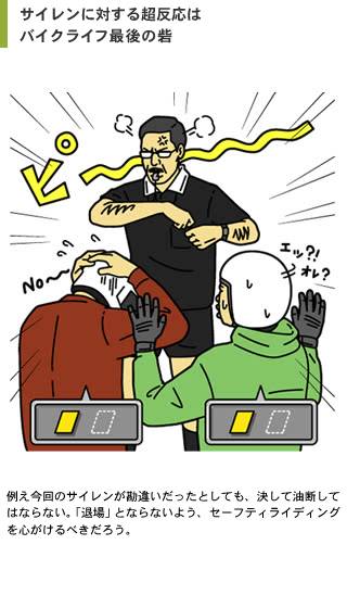 自由を愛するライダーにとって、走りに制限を加える交通法規には大なり小なり不満がある。だからといってそれに抵触した場合、国家権力たるポリスメンからの痛烈な仕置きが下ることを忘れてはならない。ほんの一瞬の愚行により、ライダーの命たる免許そのものが大ピンチに陥ることもありうるのだ。免許が無ければバイクに乗れず、ライダー生命を絶たれたに等しい。ゆえに、バイクライフを死守するという悲壮なまでの決意こそが、サイレンに対する異常な恐れとして発露しているのだ。サイレンの音に体が反応するようではライダーとして修行が足りない証明。一度自らのライディングスタイルを見直すべきだろう。日々自らを研鑽し、サイレン程度で砕けない鉄壁のセーフティライディングを身につけて欲しい。