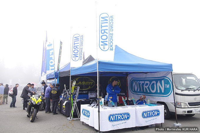 05バイクの甲高いエキゾーストが、霧に包まれた駐車場に響き渡ります。その音の方へ向かうと、DYNOMANがダイノジェットでパワーチェックを行っていました。実際にどれぐらいパワーが出ているのか、皆さん興味津々。内燃機系のセッティングを得意とするショップだけに、車両に関するアドバイスももらえました。