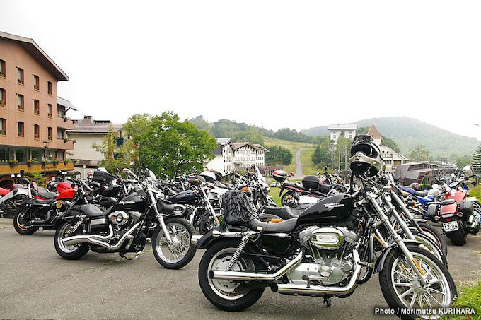 51会場の駐車場だけでなく、宿泊する宿の駐車場へ直接バイクを止める人もいます。そのため、志賀高原の至る所でバイクを見かけます。