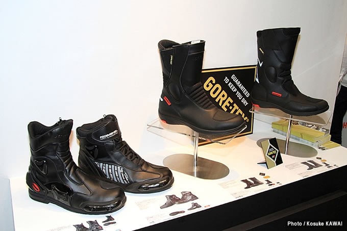 22同じくコミネで、夏に最適な通気性抜群のスポーツライディングシューズ(左)と2013年6月入荷予定のゴアテックス製ライディングブーツ。ゴアテックス製はグリップ力の高いビブラム製ソールを採用、なおかつ歩きやすさにも重視。サイドジッパー付きで使いやすそうな一品です。