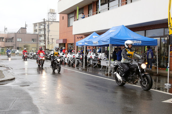 雨の中、集まった参加者たち。楽しみながらバイクの知識と運転技術向上のために頑張りました。