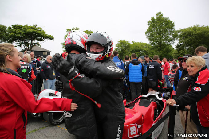 07サイドカーレース1が終わった直後のパークフェルメ(車両保管場所)。無事に完走した喜びが爆発します。2人はサイドカーのレジェンド、ロイとローズ・ハンクス夫妻。ロイは今年引退、ローズはTTで唯一、女性で表彰台に上っているパッセンジャーです。