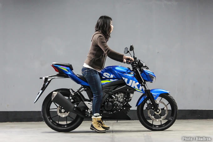 シート高785mm、車両重量133kgのアグレッシブなストリートスポーツモデルGSX-S125を、150cm、160cm、175cmのテスターが足つきチェック。17インチの大径ホイールを履いているのが小柄な女子にはちょっと不安?
