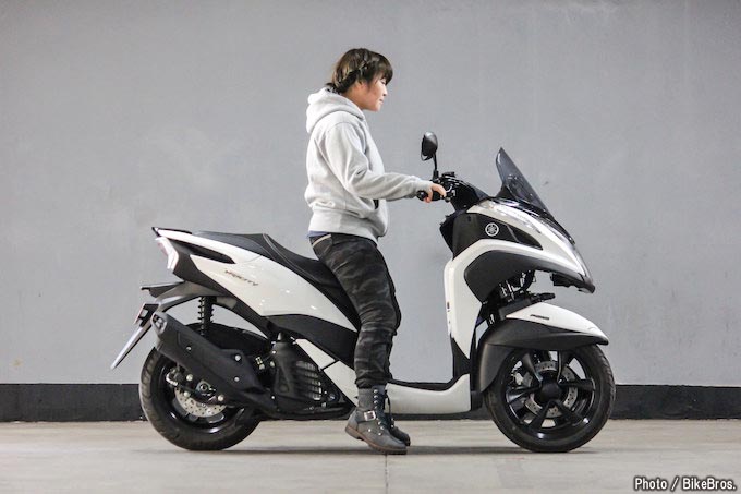 今回の足つきチェックターゲットは、2014年の販売開始時に大島優子さんが出演するCMの「ナニコレー!?」や「リーン」が話題になったヤマハのTRICITY 125 ABS(トリシティ125 ABS)です。ぱっと見ればわかるように、フロントを二輪にしたことで高い安定性をもつ、オートマチックコミューター・TRICITY 125ですが、そこには旋回時にフロントの二輪と車体が同調してリーンするヤマハ独自のLMW機構(Leaning Multi Wheelのことでバイクのように傾斜して旋回する3輪以上の車両の総称)で安定性の高い走りを実現しています。