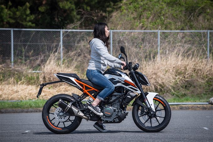 KTMの250DUKE。シート高は830mmと女子が跨るにはちょっと強敵?! 車両重量は147kgとそんなに重い印象はないので上手くバランスを取って跨りたい。160cm、175cm、180cmのテスターが足つきチェック。