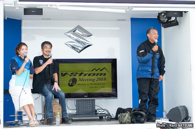 一方ステージではスズキ株式会社 鈴木俊宏社長の開会宣言の後、Vストロームで全国を旅するバイク冒険家の賀曽利隆氏、650オーナーのノアセレン氏、雑誌アウトライダーの菅生雅文氏とスズキ開発陣が集まりトークショーがスタート。参加者からは多くの質問や意見が飛び交い、オーナーイベントらしい活気のあるトークショーとなった。