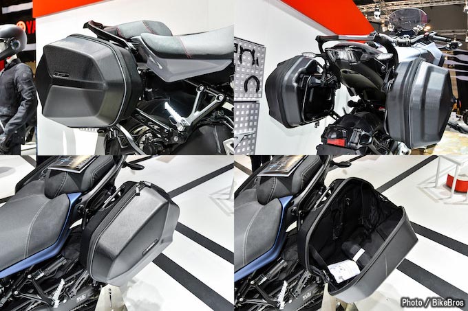 会場に展示されていたナイケンGTはソフトシェルのパニアケースを装備していた。容量は未確認だが、フルフェイスヘルメットは収納できそうだ。