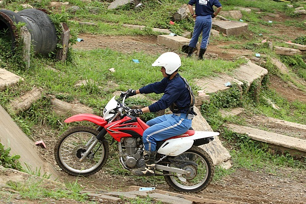 白バイ大会の種目の中にはトライアル競技もある。従来はトライアル専用モデルを使用していたが、今年からは一般的なトレールモデルのXR230に変更されたため、セクション攻略の難易度は逆に高くなったと言える。トライアルでは操作系のタイミングに加え、いかに柔軟かつダイナミックに体を動かしてバランスをとっていくかがポイントになる。