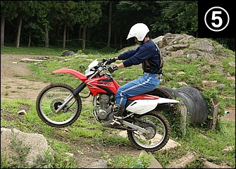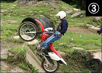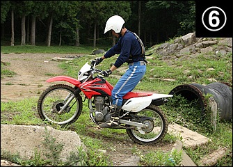 今回のテーマは段差越え、トライアルで言うステアケースだが、ここでも高度なバランス能力が求められる。急な斜面を登り切る直前の写真を見れば、バイクとライダーがちょうどV字のように開いていることかが分かるはず。もし、ここでライダーがバイクにしがみ付くと後輪のトラクションが抜けてしまい登っていけないし、逆にライダーが後ろに反りすぎてもまくれてしまうだろう。スロットルワークと体のアクションを使って、いかにタイミングよくきれいに後輪にトラクションを与えていくかがカギ。滑りやすい路面ではなおさらだが、ヘタにパワー全開で登ろうとしても勢いだけでは滑ってしまうだけだ。オフロードで身につけたバランス感覚やトラクション感覚は、ロードでの走りにも必ず役に立つ。まずは小さな段差を見つけて、無理のない範囲で何回もトライしながら操作や動作の感覚を身につけていただきたい。