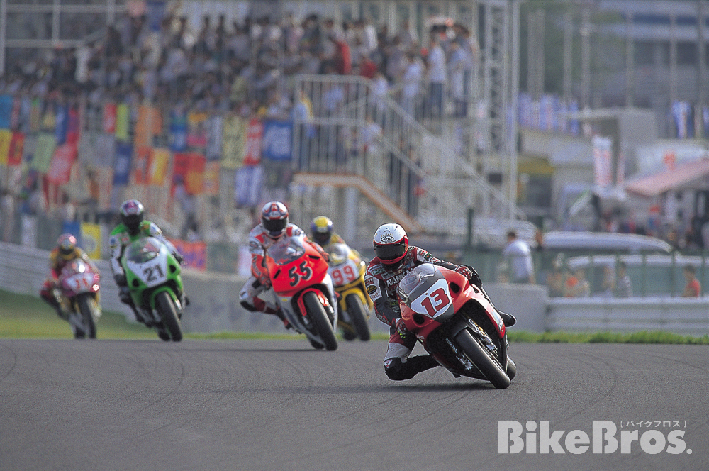 1999年全日本で大柄で曲がらない隼レーサーをねじ伏せる#13鎌田。彼はS-NKクラスのチャンピオンに輝く。(Yoshimura Archives)