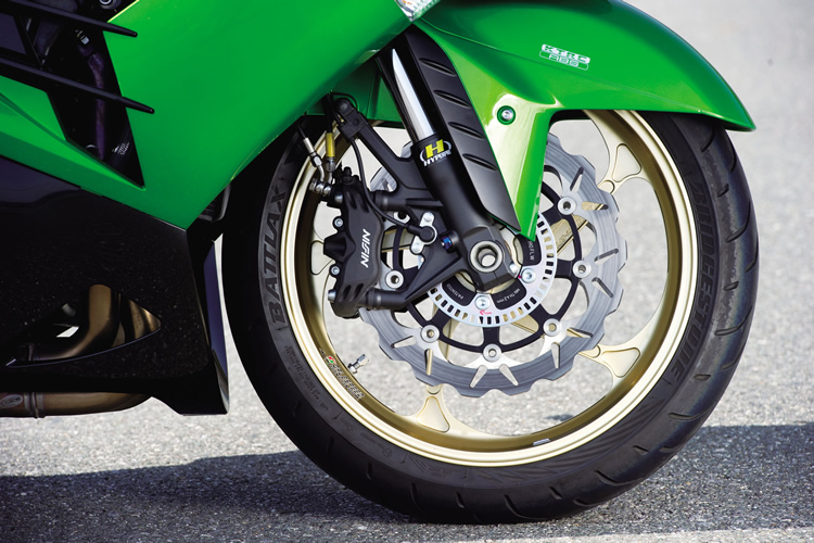 もちろん、カワサキはそうしたユーザーに対して、ZX-10Rやニンジャ1000などを準備しているものの、やっぱりカワサキ好きなら最高峰のフラッグシップで、動力性能を追求してみたいではないか。そんな印象を抱いた僕は、実は初試乗時から、ホイールやマフラーを軽量化した14Rに乗ってみたいと考えていたのだが……。その気持ちが通じたのか、アクティブさんのご好意で、ゲイルスピードホイールの最新作であるタイプGP1Sを筆頭に、数々のカスタムパーツを装着した14Rに試乗させてもらえることとなった。