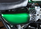 初代W650の登場から15年、2011年には排気量をUPして進化を遂げたW800をバランスよくカフェレーサースタイルに仕上げたカスタムコンプリート。低い位置のセパレートハンドルと、ノーマルシートに被せるオリジナルシートカウル、これにツンと上を向いた2本出しのオリジナルマフラーを合わせることで、見事に流麗なラインを完成させている。W800の場合、ノーマルはタンクにタンクパッドが装着されているため、パッドを外すとそのステーや凹みが現れる。このコンプリート車は、滑らかなタンクを実現させるため、その凹みをパテで盛ってならし、その後にオールペイントするというこだわりようだ。バックステップやミラー、フェンダーもカスタム仕様で、リア周りもフェンダーレスキットによりすっきりしている。オールペイントはあくまでも一例で、このレーシーなグリーン以外にオレンジやブラックなど、ユーザー好みのデザインが選べる。また、車検対応のオリジナルマフラーは、クローム以外にブラックも選択可能だ。これだけ揃って価格は923,000~1,324,000円だから相当リーズナブルだろう。もちろん割高になるが、既存車両へのカラーリングオーダーや、パーツのみの換装も可能だ。