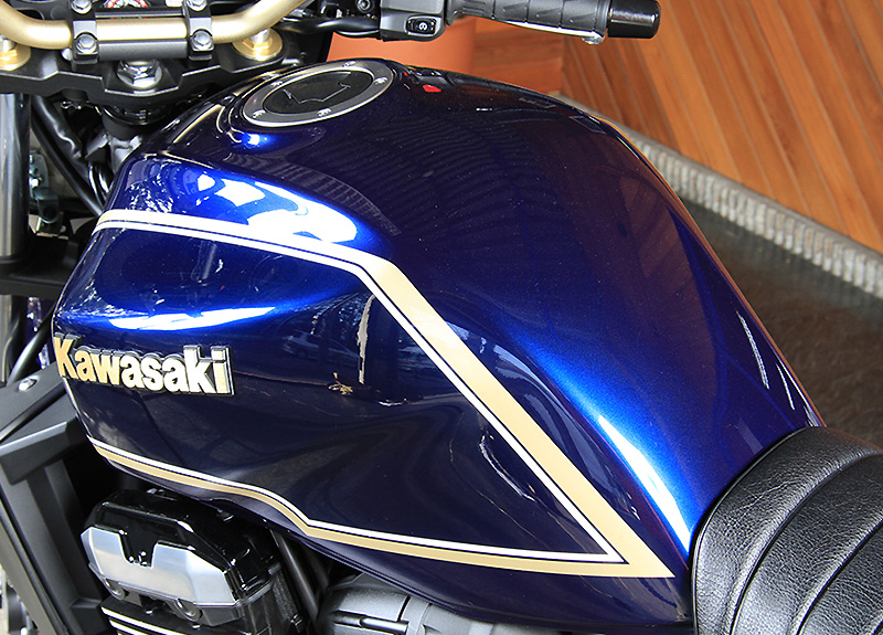 ZRX1200DAEGは乗りやすさが人気のカワサキのネイキッド。このダエグに往年の名車「Z1000Mk.Ⅱ」のカラーリングを施したライトカスタムがこのマシンだ。Mk.Ⅱの純正カラーは、ルミナスネイビーブルーと言って通称「ナス紺」などと呼ばれる若干赤みがかった深い紺色だが、このダエグはその紺とゴールドの子持ちラインを忠実に再現している。マフラーはノジマエンジニアリングのブラックメガホンフルエキゾースト(車検対応)を採用し、シートはタックロールシートへ。ラジエーターカバーとインジェクターカバーをつや消しブラックに。艶やかなタンクやサイドカバーと対照的に、マフラーやカバー類をつや消しブラックにすることで、ワイルド&クールな印象を強烈に打ち出すことに成功している。同店でノーマルの新車を買ってここまでカスタムすると、およそ1,464,000円かかるが、コンプリートプライスなら1,284,000円だから、その差額はなんと180,000円にもなる。ダエグはこのほかにも特殊塗料をつかった「PRライン」仕様のブラックカスタム、ホワイトカスタムや、マフラー、バックステップ、メッシュホースで武装したスポーツカスタムなどいろいろ揃えている。
