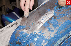 必要以上にパテを厚付けすると水研ぎ工程で苦労するので、補修箇所に合わせてパテを盛り付けていく。極小さな凹みは、パテをへらで擦り付けて施工する。