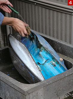 旧い塗装がすべて除去できたら、タンクを水洗いする。ここで剥離剤を残すと下地にダメージを与える可能性もあるため、洗浄は念入りに行われ、次の工程に進む。