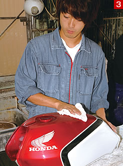 リペイント作業のため入荷した外装部品は、まず現在の塗膜を除去する剥離作業が行われる。金属パーツの場合、剥離作業は剥離剤を使用して行われるが、樹脂パーツの場合は素材を痛めるため、水研ぎにて塗膜を落とす。塗膜が落ちると以前に補修されたパテなどが現われることもあるが、パテの下に錆が発生しているケースも考えられるので、パテはこの剥離作業の段階ですべて除去される。ちなみにパテ補修を受けた部分は、塗膜の上からでは判断が付きづらいが、磁石を使えばすぐに判別できるそうだ。