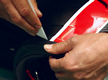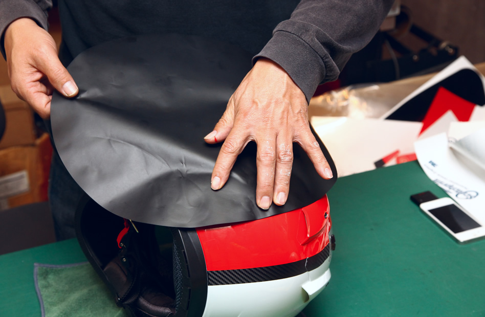 23余分をカットする際はカッターを使うが、ヘルメットにキズをつけず、フィルムにだけに刃を入れて切っていく。これは経験がものを言う職人技だ。