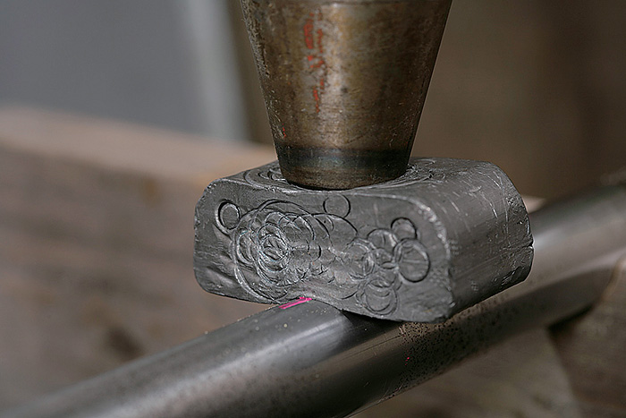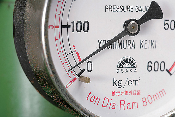 押しコマとして用意したのが鉛の固まりである。鉛はご存知のように硬いようで柔らかく、圧力に対して追従する傾向があるため、この特性を利用するのだ。当初は直に押し始めたが、油圧プレスの押しコマ部分が食い込んでしまうので、厚いアルミ板を噛ませて、面圧が均一になるように押したところバッチグー。何度も繰り返し作業していくうちに、四角いブロックだった鉛が、内側が丸くなった凹形状に変化していった。鉛押しはベストかも知れません。