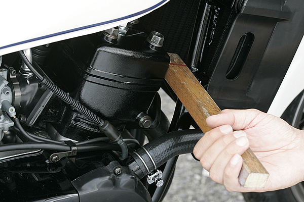 そんなRZシリーズの中古車購入時の注意点は、経年劣化を探すことが主になる。数多い事例として挙げられるのが、ウォーターポンプのメカニカルシールの劣化によって漏れた冷却水が、ギヤボックスに混入するトラブルだ。これはギヤオイルのフィラーキャップを開け、中を見れば確認できる。内側に白く乳化したオイルが付着していたら、漏れが発生している可能性が高く、メカニカルシールの交換が必要だろう。チェンジシャフトやカウンターシャフトのオイルシールからオイル漏れがないかも確認しておくと良い。