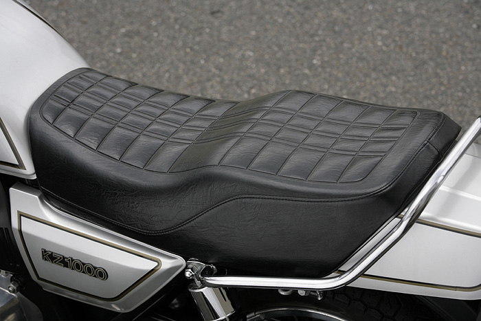 キャブレターはそれ以前のVMタイプに代わって、減速時のエアカットバルブ付きの負圧タイプ、ミクニBS34を装備 | クロームメッキのサイレンサーには、リバースコーン風のエンドキャップが付く。ホイールサイズは18×2.50。リアブレーキは大径ローターで十分な制動能力を持つ。 | 軽く段の付いたシートは座面、スポンジともZ1000Rより大きくて厚く、座り心地も良好だ。着脱はシート下のレバー操作で行う。 |