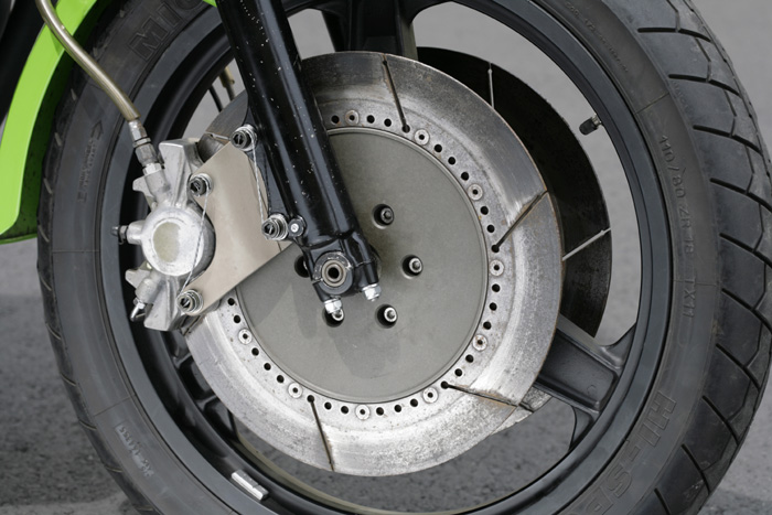 ベアリングホルダー付きインナーを持つブレーキローターやキャリパーは当時のワークスS1用パーツを見つけだし、ダイマグ製ホイールもワークスマシン用パーツを装着した。曲げ加工で作られたキャリパーサポートもマグネシウム製のS1用だ。同じくリアブレーキ&ホイールもS1用の本物パーツを奢っている。またS1のフロントフォークはZ1000Rより50mmほど長いので、R用より長いアメリカンモデル(CSR1000用)を流用して本物らしさを追求。